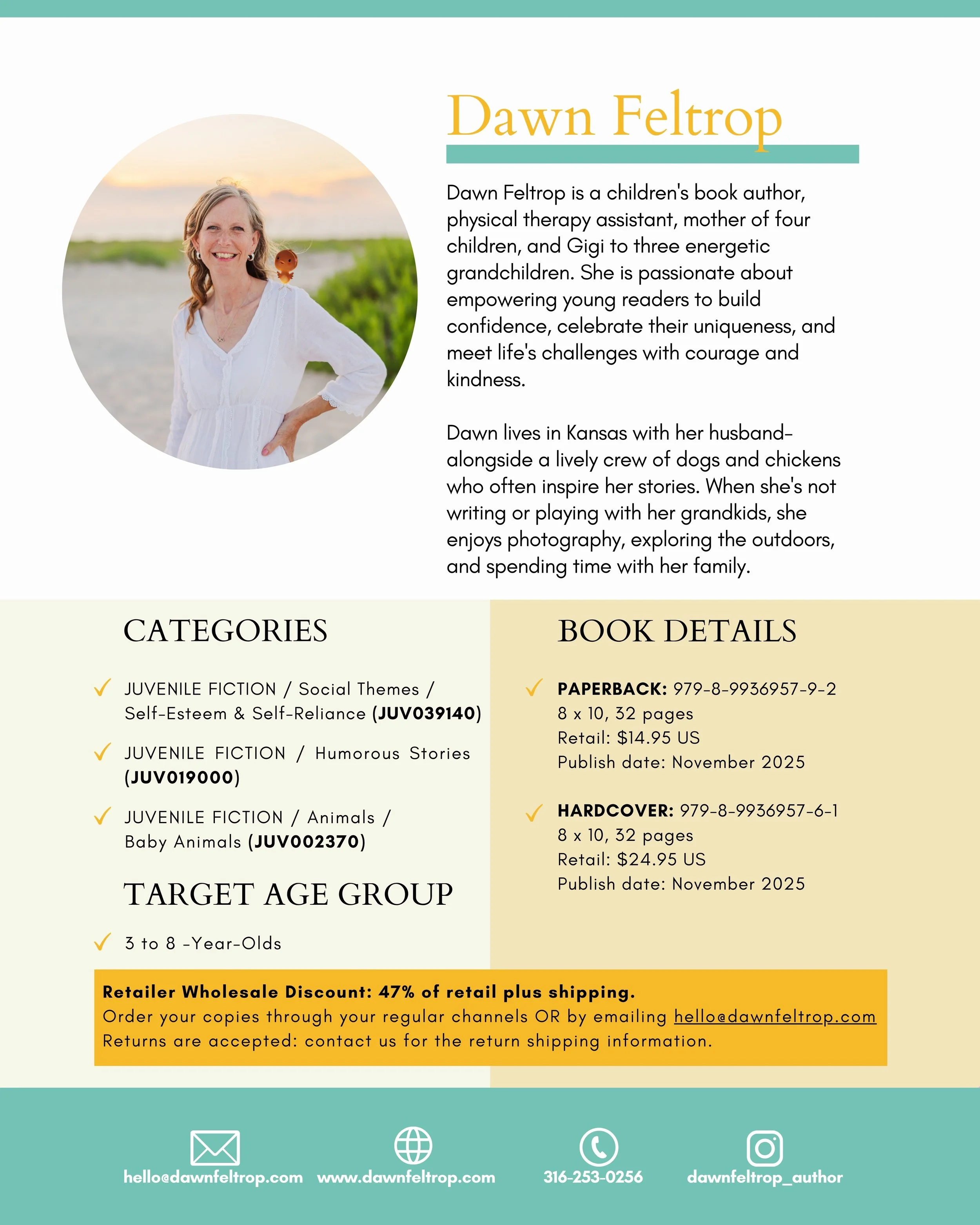 Dawn Feltrop is a children's book author, physical therapy assistant, mother of four children, and "Gigi" to three energetic grandchildren. She is passionate about empowering young readers to build confidence, celebrate their uniqueness, and meet life's challenges with courage and kindness. Dawn lives in Kansas with her husband-alongside a lively crew of dogs and chickens who often inspire her stories. When she's not writing or playing with her grandkids, she enjoys photography, exploring the outdoors, and spending time with her family.